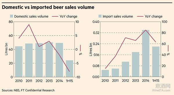 但即便作为市场领先者的青岛啤酒和华润雪花啤酒(CR Snow)——他们的中等价位及高端啤酒的销量分别占到总销量的40%和45%——也面临进口品牌快速增长带来的挑战。上半年国产啤酒的销量出现下滑,但进口啤酒销量上升了63%,继续保持了近年来的快速增长势头,原因包括进口成本大大降低以及国内夜店数量大增。