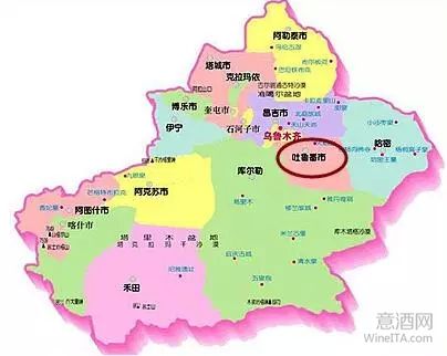 包括低于海平面300米的吐鲁番盆地的鄯善、红柳河,这里四面环山,热风频繁,夏季温度极高,达45℃以上,年活动积温5319℃;雨量稀少,全年仅有16.4mm。这里是我国无核白葡萄生产和制干基地。该地的新天国际葡萄酒业有限公司是近年来葡萄酒业一只强大的生力军,拥有15万亩的葡萄园 “楼兰”、“新天”、“西域”、“尼雅”等葡萄酒品牌已经成为西部酒业的主打产品。