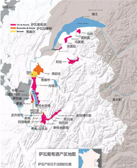 萨瓦位于法国东部,其东边是瑞士,北边是法国知名的稻草酒产区茹拉(Jura),西边是不太知名的布热(Bugey)产区,南边是南罗讷河谷(Southern Rhone)和普罗旺斯(Provence)。从正式的行政区域划分来看,萨瓦是法国东南部罗讷-阿尔卑斯大区所辖的省份。作为一个葡萄酒产区,萨瓦主要有萨瓦(Savoie)和上萨瓦(Haut Savoie)等子产区,有少部分葡萄园分布在伊泽尔(Isere)和艾因(Ain)。