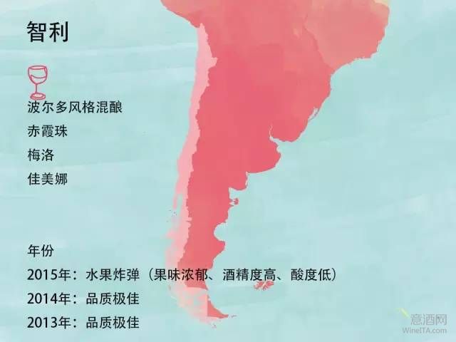 阿根廷是目前世界第五大葡萄酒出产国,然而其葡萄酒业的腾飞却是从 20 世纪 90 年代才开始。阿根廷的葡萄酒产区遍布全国,但多集中在西部安第斯山脉的山麓地区。这些葡萄园海拔普遍较高,大约在 700 至 1,400 米之间,夜间温度普遍偏低,有利于酿出颜色深厚、味道浓郁的红葡萄酒。该国最重要的红葡萄品种是马尔贝克(Malbec),如果你是马尔贝克爱好者,可以购买 2013 年的马尔贝克葡萄酒,因为 2014 年和 2015 年的马尔贝克表现平平。