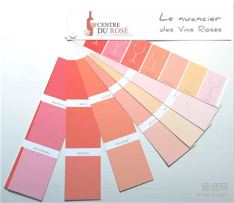 桃红酒是一种“高颜值”的葡萄酒。法国桃红酒研究中心(Centre du Rosé)发布的一份桃红酒色卡显示,常见的桃红酒颜色可分为7种,包括:荔枝肉色litchi、水蜜桃色pèche、三文鱼色saumon、杏黄色abricot、珊瑚色corail、覆盆子色framboise、樱桃色cerise。