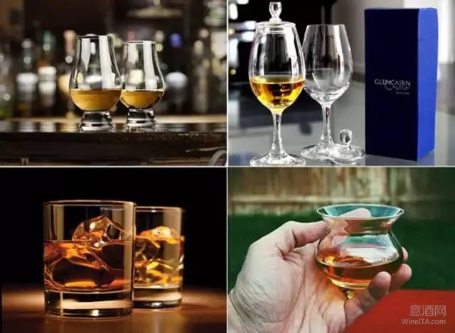 常见的威士忌杯有格兰凯恩杯(Glencairn Glass)、郁金香闻香杯(Copita Nosing Glass)、平底无脚酒杯(The Tumbler Glass)及纯净杯(The Neat Glass)(如图)。前两者适宜专业闻香和品鉴时使用,平底无脚酒杯常用来盛放加冰的威士忌,纯净杯则多用于珍稀或年老威士忌的品尝。此外,ISO 杯是国际标准的盲品专用酒杯;有时候白兰地杯也被用来喝威士忌。