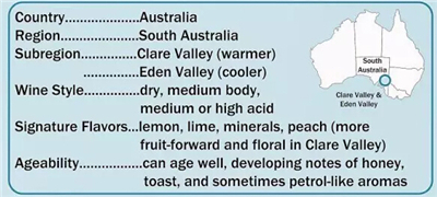 位于南澳大利亚州境内的伊登山谷(Eden Valley)和克莱尔山谷(Clare Valley)是公认的澳洲优质雷司令葡萄酒产地,两地区都是偏寒冷的气候,所出产的雷司令干白葡萄酒有着柠檬般清新和鲜花的芳香,口感细腻,清爽而不失回味。