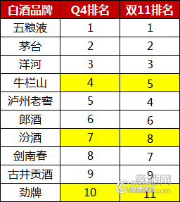 得益于对京东双11大促的积极参与,以及后续持续的品牌推广与曝光,五粮液、茅台、洋河、牛栏山、泸州老窖、郎酒、汾酒、剑南春、古井贡酒在第四季度销量一路飘红。其中,牛栏山通过最大化的依托京东品质服务优势,并与京东深入配合爆品直降,重新夺回京东白酒第四品牌宝座!同时,汾酒则通过与京东官方旗舰店推出品牌联合满减大促,一举改写京东白酒排行榜,在第四季度销量力压剑南春!双十一期间,劲酒屈居习酒之下未能进入前十名,通过与京东战略合作定制爆款,12月实现突破性增长,第四季度整体排名冲刺至前十!