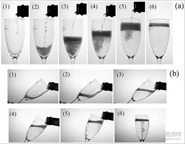 直冲式倒法(a)与斜溜式倒法(b)。可以发现,斜溜式产生的泡沫少,而直冲式产生的泡沫多。