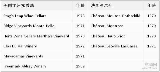 1976年5月24日,英国酒商史蒂芬·斯珀里尔(Steven Spurrier)在巴黎组织了一场别开生面的葡萄酒盲品大赛。比赛分两部分,需要盲品选出最佳红,白葡萄酒。参赛的红葡萄酒来自法国的波尔多和美国的加州;白葡萄酒来自法国的勃艮第和美国的加州。比赛的结果是:美国加州的葡萄酒拔得头筹占据红白榜首,这不仅让法国人惊讶,也让全世界对美国葡萄酒刮目相看。
