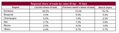 上周波尔多葡萄酒的表现不错,该酒区占交易总额82.2%,高于前周的72.4%和3月份的78.1%水平。一级酒庄也交易活跃,占交易总额40.9%。当中表现最佳的是奥比昂Haut Brion,占了一级酒庄31%的交易份额。