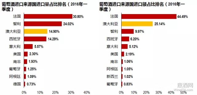 数据显示,2016年一季度,中国对澳洲葡萄酒的进口量为20.7百万升,排名第三位,同比增长58.8%,环比增长17.2%;进口额为148.7百万美元,排名第二位,同比增长50.5%,环比增长23.4%;进口价为7.2美元/升,同比下滑5.3%,环比5.3%。