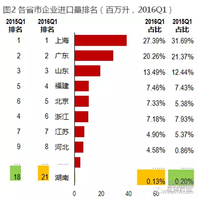 图2 各省市企业进口量排名(百万升,2016Q1)