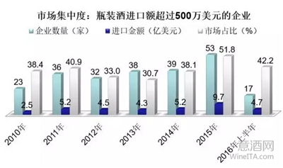 四、市场集中度较低,经营主体不稳定,市场秩序比较乱。存在这些问题的同时说明行业整合的机会很大。尽管十年以来有上万家葡萄酒进口商,但几乎没有任何一家企业能够连续多年保持销售额十亿元以上,又保持增长的态势。海关每年进口企业统计列表里面有约40%进口葡萄酒企业会在第二年消失,可能有部分企业委托物流、报关公司代理,但还是说明企业退出市场的比较多,行业淘汰率很高。