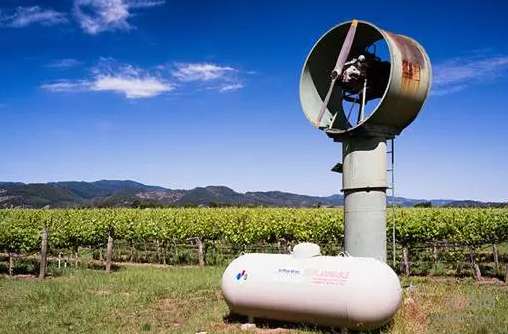 利用空气对流来提升葡萄园温度。风机的外形就像个巨大的风扇,它能吸入上方温暖的空气,然后在地面放出暖空气,将地面的温度保持在0℃以上。现在的风机一般还结合了加热装置。