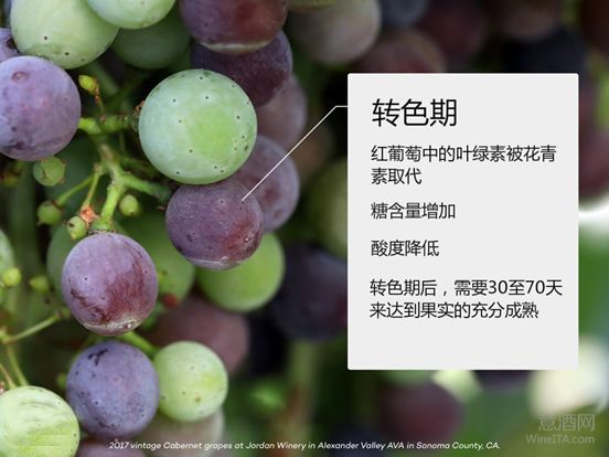 在转色期前,葡萄果实个头很小、很硬并且具有很高的酸度。由于叶绿素的存在,此时的葡萄还都是翠绿色的外表。当转色期开始后,葡萄藤就逐渐将贮藏在根部的营养物质运输到果实上。葡萄内的叶绿素随之被“花青素(红葡萄)”或“类胡萝卜素(白葡萄)”、糖分和其他营养物质取代。在转色期后,葡萄果实的体积会显著增大,同时还会继续积累糖分(葡萄糖和果糖),并且开始生成香气物质。与此同时,果实内的酸含量开始不断降低,糖含量不断升高。直到酸和糖的比例达到完美平衡,此时的葡萄也就达到了最佳的成熟状态,我们就可以进行采收工作了。