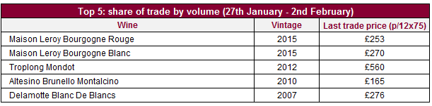 本周勃艮第十分热卖。 Maison Leroy Bourgogne Rouge 2015年和Maison Leroy Bourgogne Blanc 2015年同时成为五大最高交易价值和数量的葡萄酒之一。 2014年份的勃艮第葡萄酒交易最多,其次是2015和2010年份。香槟、意大利和罗纳的交易也有所增加。