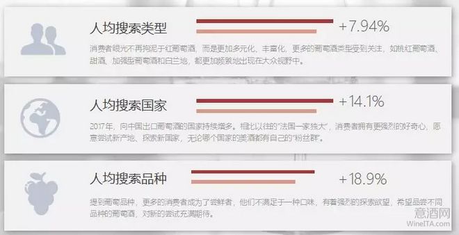 而从「酒咔嚓」2017年全年总搜索量来看,相比2016年,「酒咔嚓」全平台的搜索量在去年增加了15.1%;此外,根据海关最新公布的数据,中国进口葡萄酒在2017年进口量和进口额分别增长16.88%和17.96%,显示出中国葡萄酒市场的迅猛发展态势。
