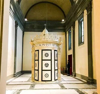 墓室由大理石打造,外形是椭圆加长方形,以佛罗伦萨百合造型修饰顶部的边缘,正方形的大理石块雕刻着各种图案装饰,与佛罗伦萨的新圣母教堂设计相同。