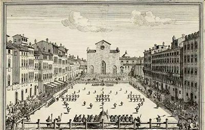 佛罗伦萨古式足球起源于16世纪的意大利,具体来说,就是佛罗伦萨的圣十字广场,五百多年过去了,这项赛事仍然在圣十字广场举行。