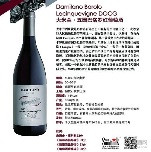 酒款10:大米兰Damilano五园Lecinquevigne巴罗洛Barolo保证法定产区DOCG干红