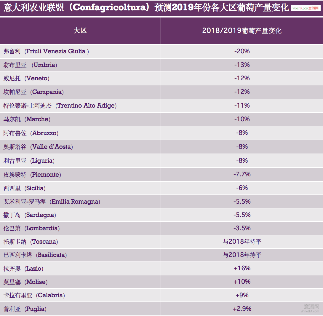 意大利农业联盟(Confagricoltura)研究中心也主要针对2019年意大利各大区的葡萄产量进行了预测。在分析了来自个大区主要葡萄酒产区的代表性酒庄的葡萄样本之后,意大利农业联盟(Confagricoltura)研究中心认为,2019年,意大利大部分地区的葡萄产量都将出现不同程度的下降。其中弗留利(Friuli Venezia Giulia )大区的葡萄产量降幅最大,预计将比2018年减少20%。翁布里亚、威尼托、坎帕尼亚、特伦蒂诺-上阿迪杰、皮埃蒙特、艾米莉亚-罗马涅等大区在2019年的葡萄产量都将出现不同程度的降幅。