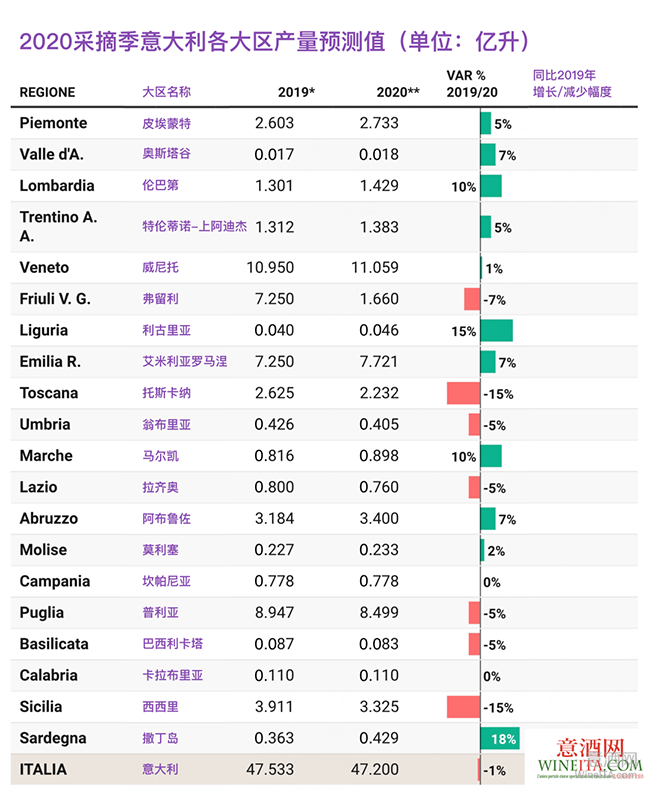 从意大利国内各大区的葡萄酒产量来看,今年意大利北部的葡萄酒产量同比2019年略增加了3%,中部和南部则分别减少了2%和7%。