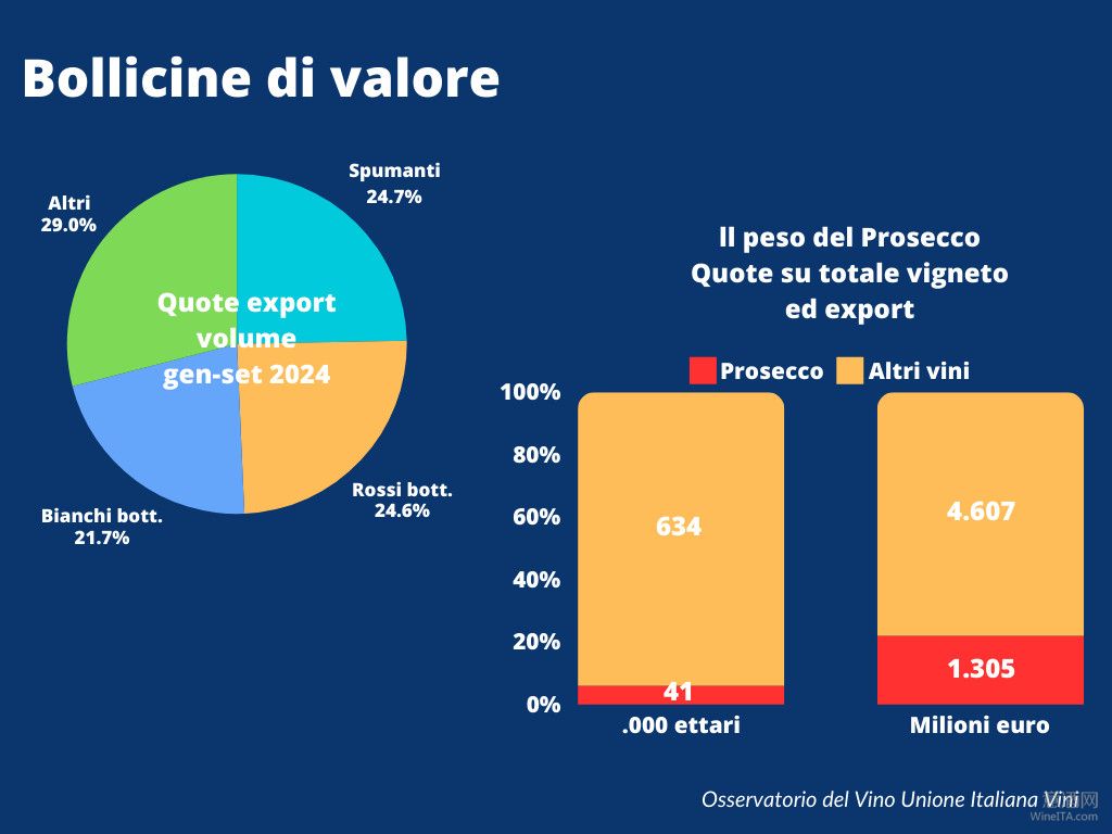 旺盛的需求让意大利起泡酒产量连年增长。预计到2024年末意大利起泡酒的年产量将超过10亿瓶,这一数字是20年前的5倍,与2023年相比增长9%。今年前9个月,意大利起泡酒的出口瓶数已经超过了红葡萄酒。